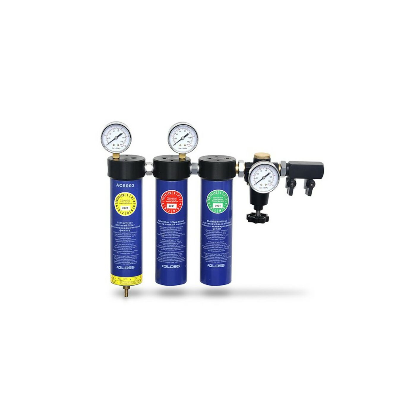 Ammattimainen vedenerotin, jossa on säädin seinäasennukseen. Suodattaa veden ja lian pois kolmessa vaiheessa ja varmistaa, että ilma on täysin puhdasta maalattaessa.