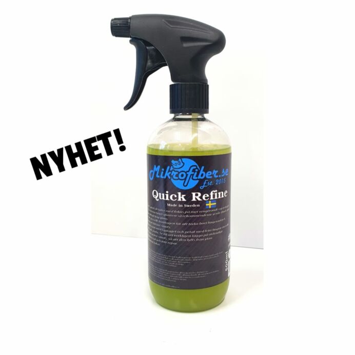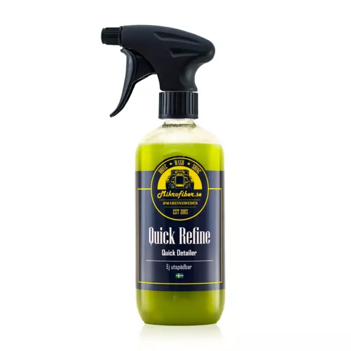 Voit käyttää Quick Refinea kuivauksen apuna pesun jälkeen, sillä se lisää myös kiiltoa. Mutta jos haluat optimaalisen kiillon, suosittelemme Quick Gloss -kiiltoamme kuivausapuaineeksi. Quick Refine sopii täydellisesti pikakiillotusaineeksi, pidä pullo autossa yhdessä Smooth Pile -mikrokuituliinojen kanssa ja voit helposti poistaa kelluvat tahrat, linnunjätökset tai hyönteiset heti, kun niitä on maalipinnalla. Täydellistä, jos olet autonäyttelyssä. Se sopii myös erinomaisesti auton puhdistamiseen, kun olet messuilla, joissa sormenjäljet ja pöly saattavat joutua maalipinnalle. Tuotetta voidaan käyttää myös ovien pyyhkimiseen, kun niissä on hieman kevyempää likaa, tai moottoritilojen pyyhkimiseen, koska se liuottaa myös jonkin verran öljyä.