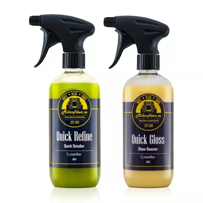 Olemme yhdistäneet Quick Glossin ja Quick Refinen Quick Wax -pakettiin, koska ne täydentävät toisiaan niin hyvin. Paketti sisältää myös 2 hienointa mikrokuituliinaamme. Quick Gloss sopii erinomaisesti kuivaustueksi pesun jälkeen. Quick Refine taas on enemmän puhdistusominaisuuksia ja sopii hyvin kuivaksi pyyhkimiseen oviaukoissa ja muualla. Tai käytä vedettömänä pesuna kesällä, kun auto on hieman pölyinen. Quick wax -pakkaus sisältää: Pikakiilto 500ml 1. Quick Refine 500ml 1. sis. suihkutuslaukaisimen Smooth Wipe 2kpl Kaikki oman sarjamme kemikaalit on valmistettu Ruotsissa. Läs mer