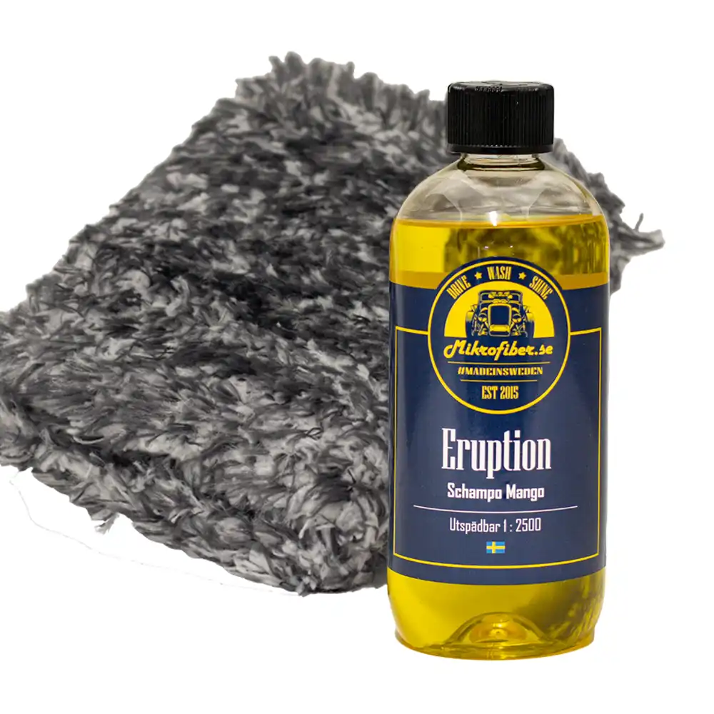 Pesupakkaus sisältää kaksi suosikkiautonpesutuotetta. Smooth Wash Pad -pesutyynymme, joka on erittäin hellävarainen maalipinnalle, ja Eruption -vahaton autoshampoomme, joka puhdistaa tehokkaasti ja tarjoaa liukkaan pinnan sienen ja maalipinnan välille vähentääkseen saippuan naarmuuntumisriskiä shampoopesun aikana. Eruption shampoo on erittäin runsas ja kestää 125 pesukertaa, jos annostelet shampoon oikein.