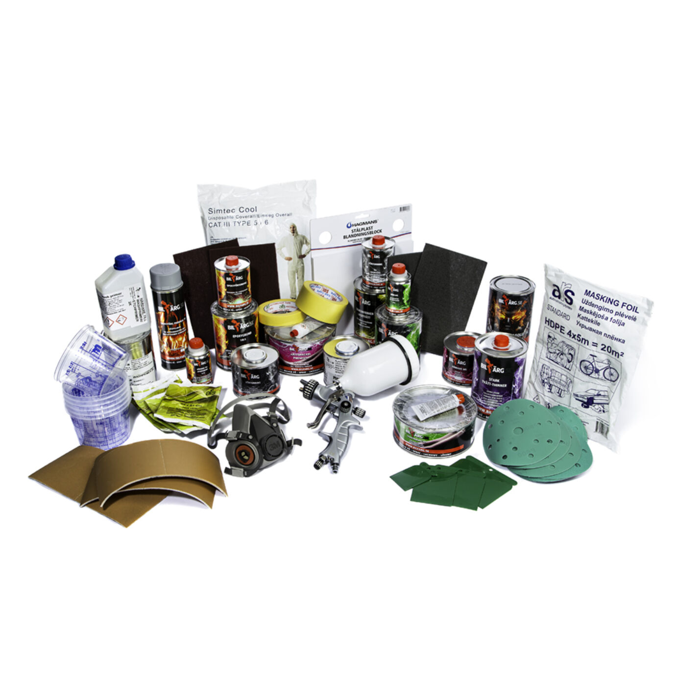 Täydellinen paketti, jossa on kaikki mitä tarvitset maalaamisen aloittamiseen. Voit valita, haluatko paketin räätälöitynä 25 %, 50 %, 100 % tai 150 % autosta. Tämä paketti sopii täydellisesti niille, jotka eivät oikein tiedä, mitä valita tuotteiksi, mutta ovat silti varmoja, että saat kaikki maalaukseen tarvitsemasi tuotteet.