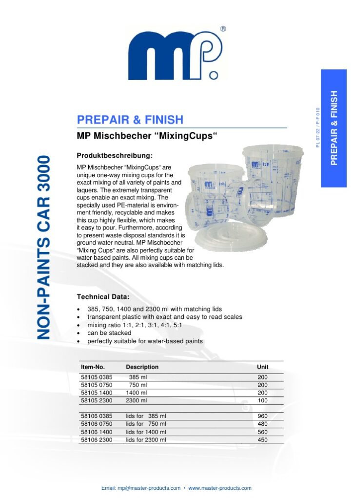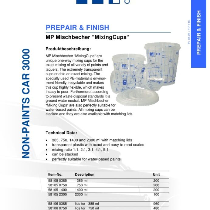 Kätevät ja kristallinkirkkaat kertakäyttömukit, joita voidaan käyttää kaikenlaisille maalimateriaaleille. Kaiverrettujen sekoitusasteikkojen 1:1 ja 10:1 ansiosta automaalin sekoittaminen on helppoa kaikille. Nämä toimivat tietysti hyvin myös muiden tuotteiden sekoittamiseen
